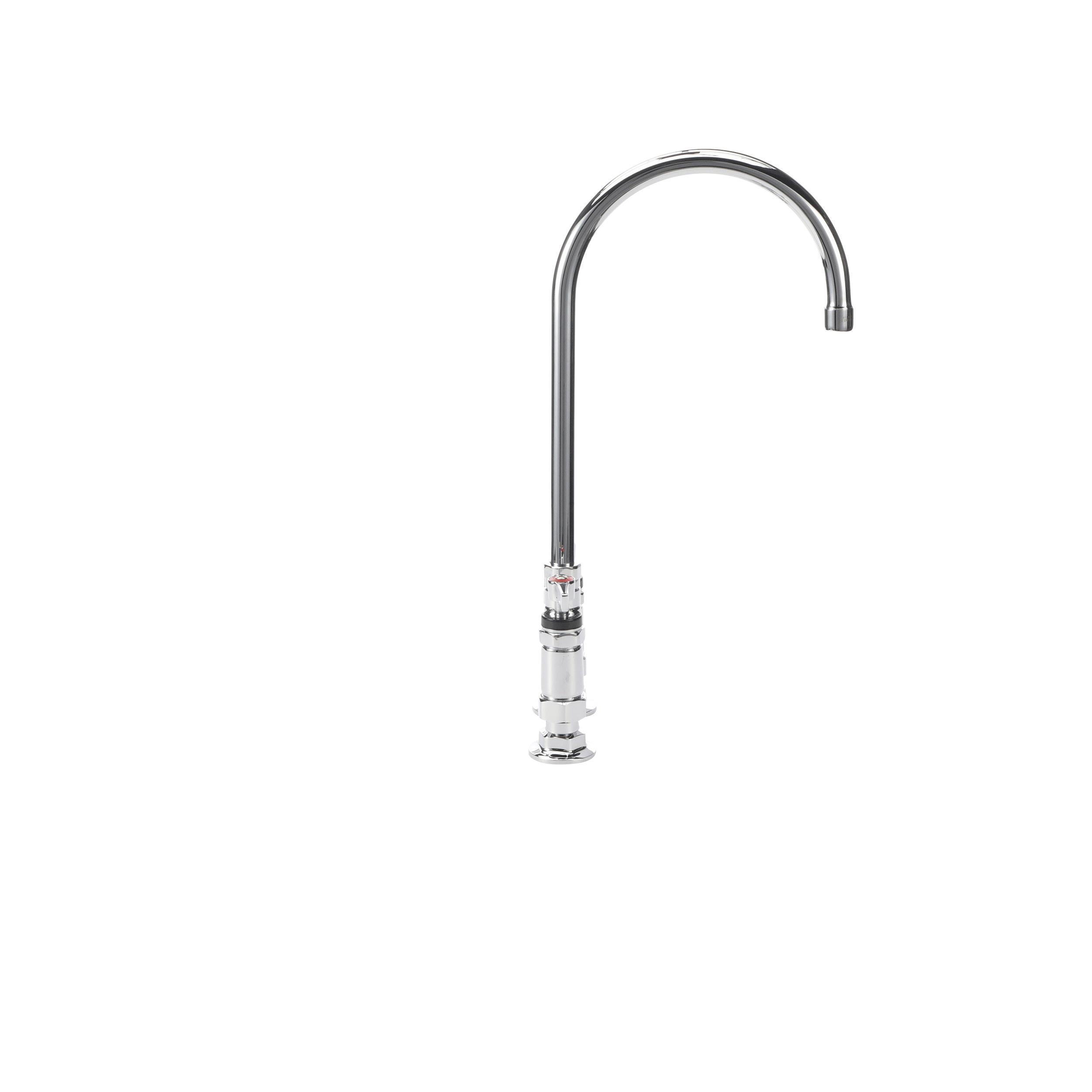 Faucet body to be constructed of polished chrome plated brass with wrist blade handles. Valves to be 1/4-turn with integral check valve to prevent cross-flow and back-flow. Spout to be stainless steel tubular swing style with double O-ring seal design. Color coded temperature indexes shall meet international standards. 2.2gpm aerator @ 60psi standard with full flow stream bubbler screen spout tip.